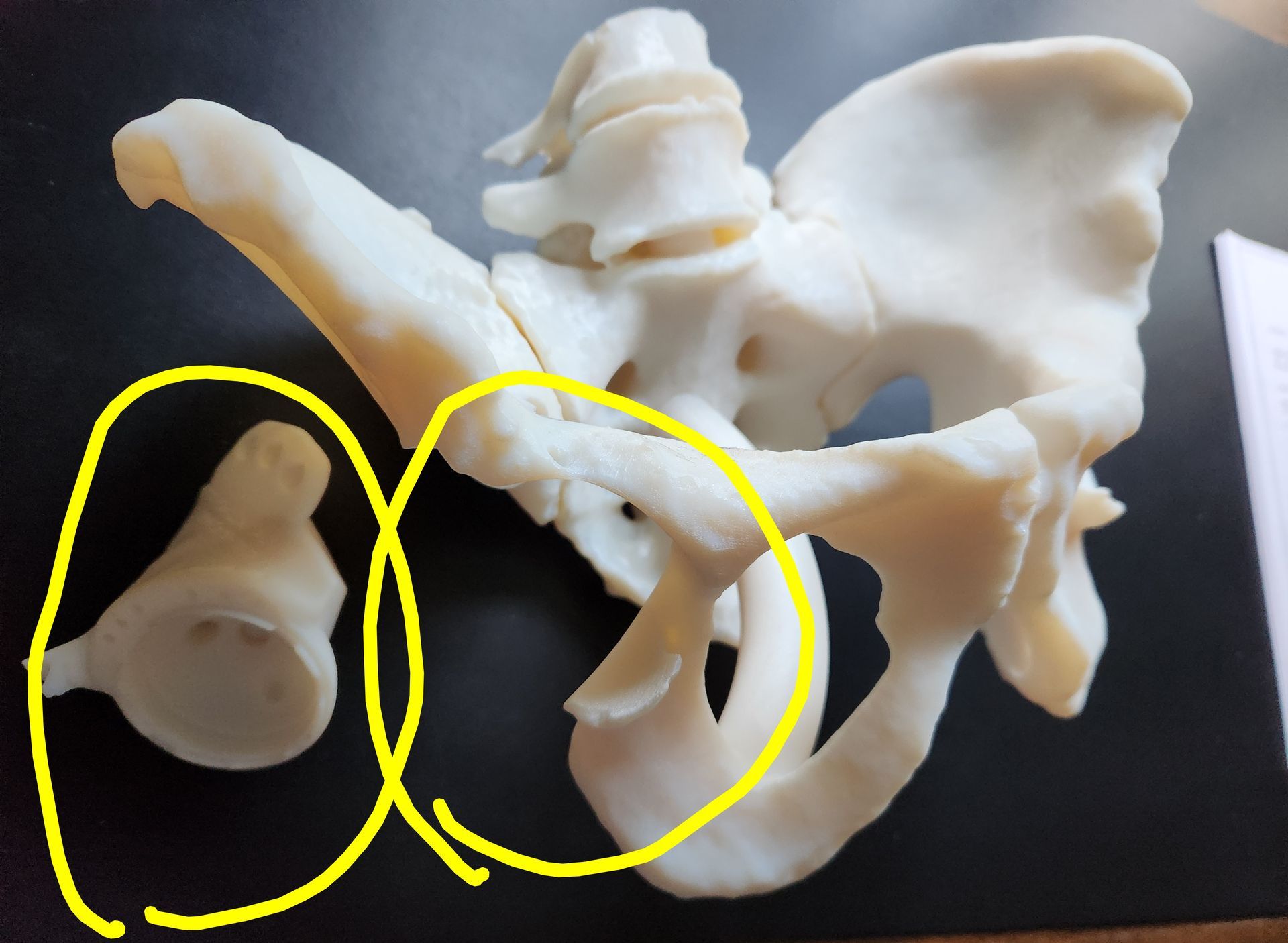 A model of the titanium implant that was screwed into that area is pictured in the left circle. To make a ball from the hip that would fit, I got a hip replacement surgery.